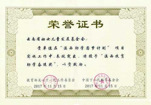 2017年11月15日,获得教育部关心下一代工作委员会、中国下一代教育基金会授予“滇西扶贫助学奋进奖”;