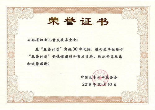 2019年10月10日,获得中国儿童少年基金会在“优米平台app下载”实施30年,授予致敬单位;